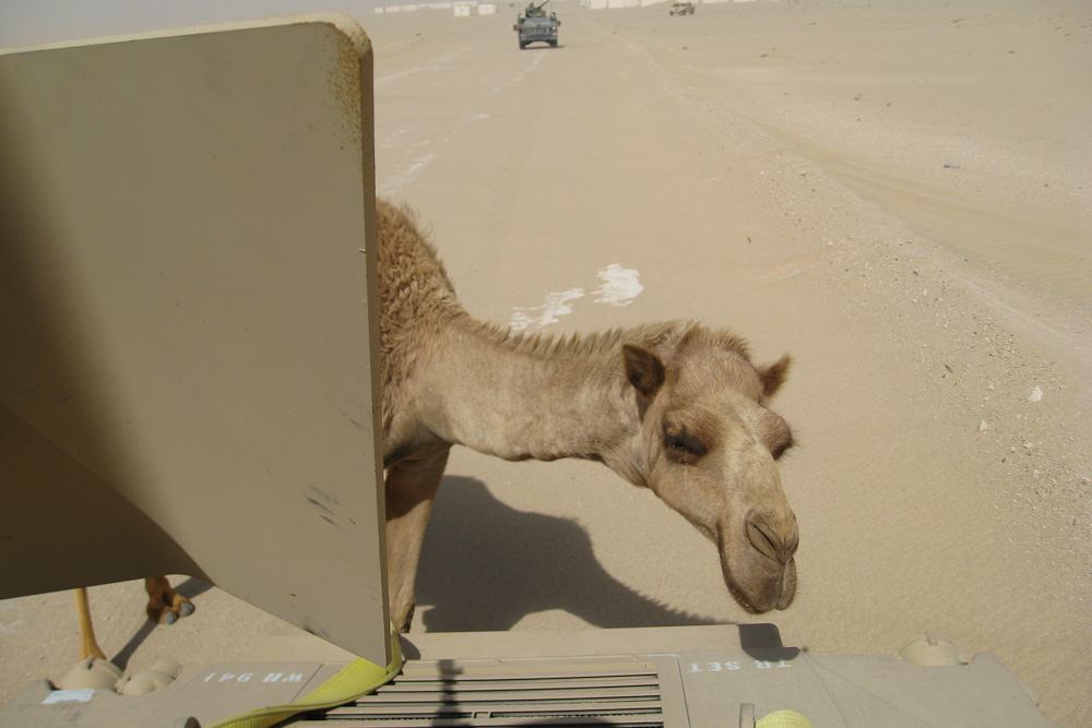 Here’s a camel we ran into out on the mission rehearsal lanes on Camp Buehring. Moments later it was sniffing our tow-strap.