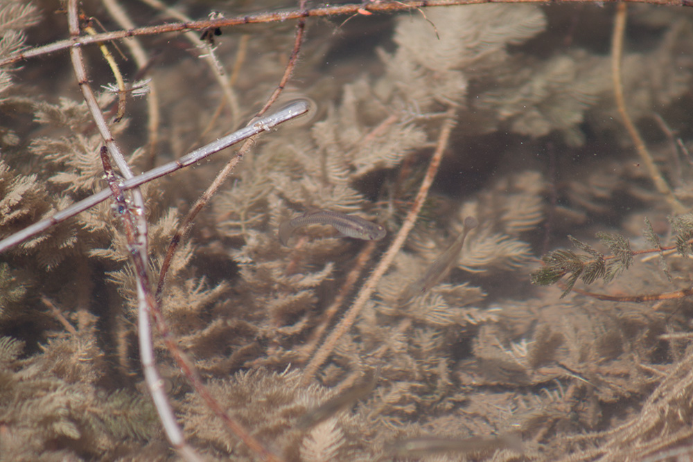 Just below the first blue dragonfly, Kelly noticed a couple of tiny fish flitting around just under the surface of the water: