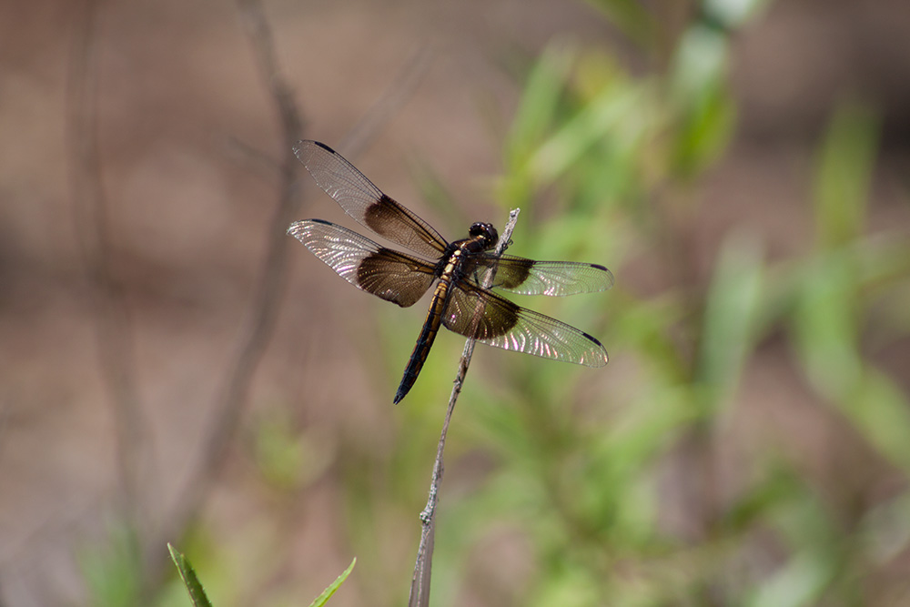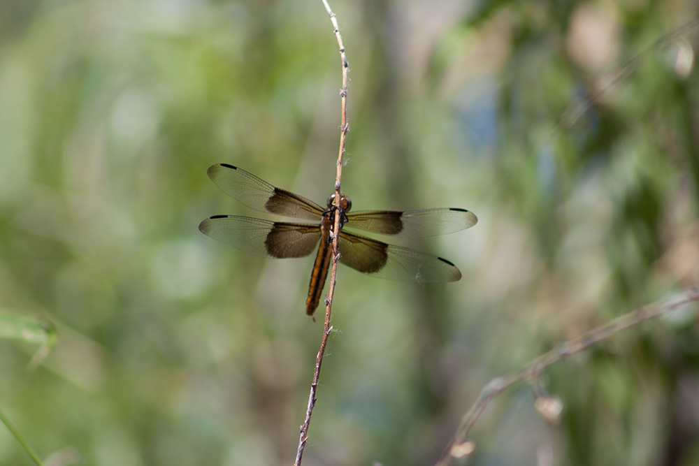 I had been trying to get shots of one of the squadron’s worth of dragonflies which were around, but to no avail. A little way further around the lake, as if in response to this, one flew up, landed on a bush, and then proceeded to stay for a minute or two before circling and re-posing in a different direction: