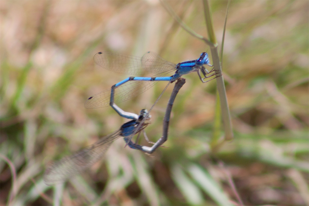 Even more difficult to capture were the tiny blue dragonflies which didn’t come up very much, but tended to hover right above the surface of the water. Managed to get one on the way out as it stopped on a piece of grass sticking up out of the water, then caught two others making more dragonflies up on the bank: